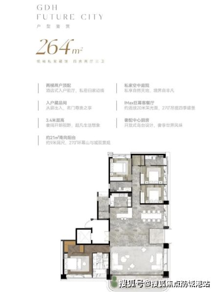 建面约140-264㎡现代美学大宅:公建化外立面设计,配备270°IMAX环幕观景视野,超20米连续采光面,户户均配有大尺度面宽阳台。