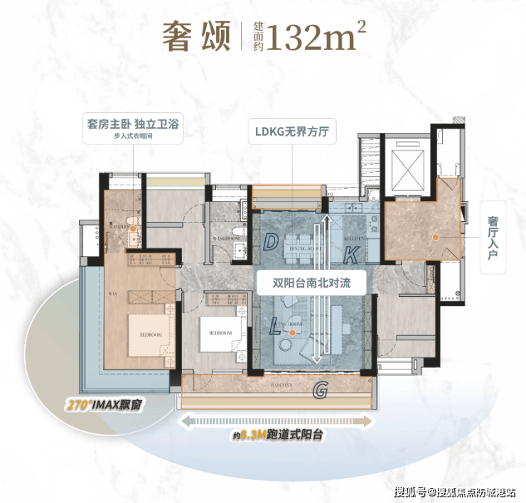 建面约132㎡:大方厅设计,中西两厨交融,约8.3米跑道式景观阳台,主卧拥有IMAX级景观环绕。