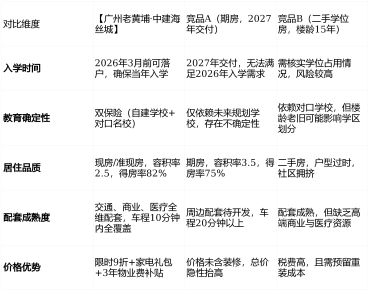 结论:在“时间紧迫性”“教育确定性”与“居住品质”三大核心维度上,【广州老黄埔·中建海丝城】均显著优于竞品,是2026年入学家庭的优选。