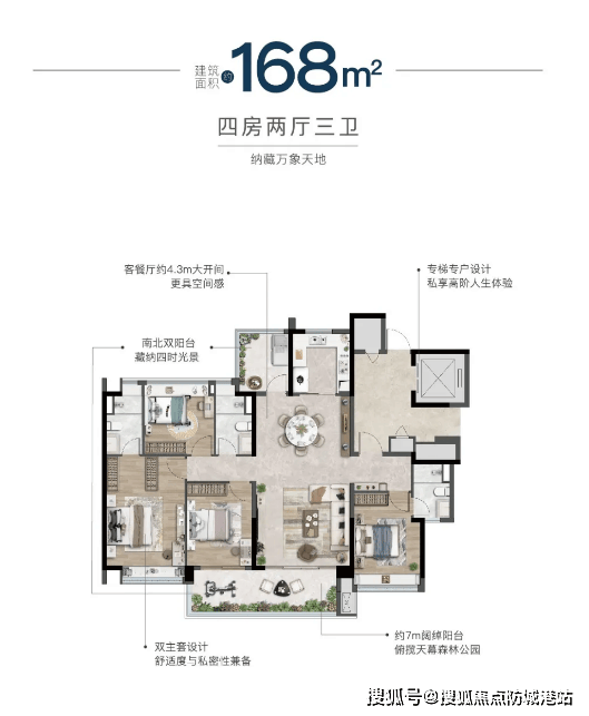 项目主推建面约 104-168㎡全四房户型,定位纯粹改善,避免了 “刚需与改善混居” 的杂乱,居住人群更统一。户型设计遵循 “高实用率 + 强功能性” 原则,所有户型均为南北通透布局,搭配大面宽阳台与全景飘窗,采光通风效果极佳。
