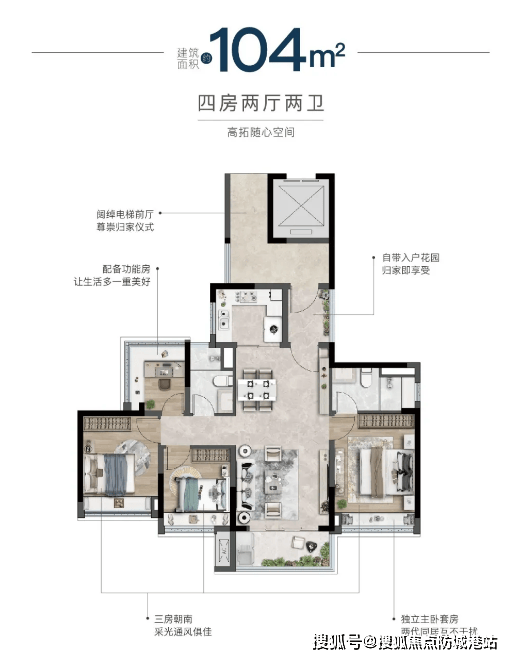 104㎡四房户型得房率约 82%,户型南北通透,客厅面宽约 4.2 米,主卧面积约 15㎡,还预留 1 个灵动空间可作儿童房或书房,完全能满足多孩家庭的居住需求,空间布局紧凑无浪费。