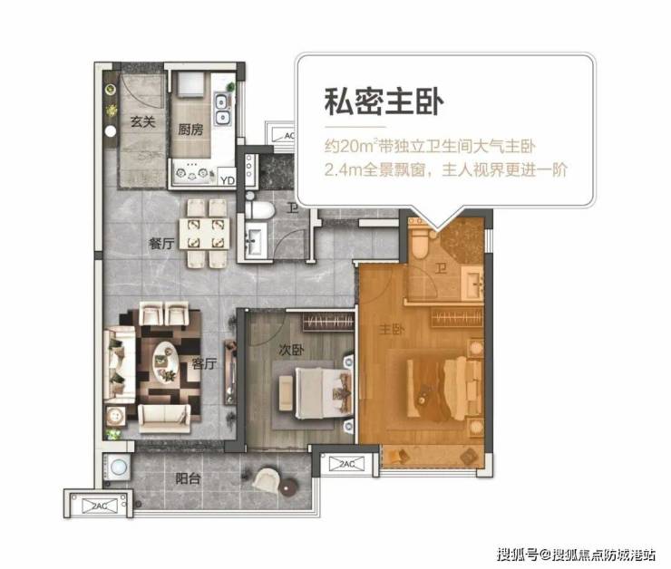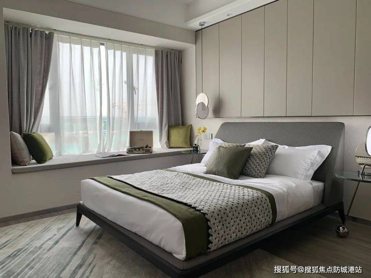 约20㎡带独立卫生间大气主卧,私密性更高。约2.4米全景飘窗,让室内更加明亮通透,主人在房间便能将窗外美景尽揽。