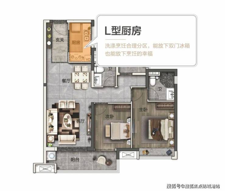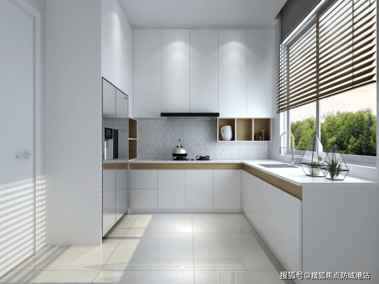 L型厨房,空间宽阔实用,烹饪动线明确,配合黄金比例厨柜设计,能让夫妻在里面施展十八般厨艺,宽松的尺度能摆下双开门冰箱,为生活品质加分。