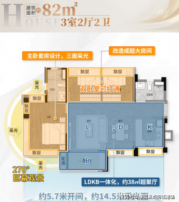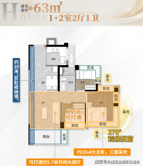 63㎡三房两厅一卫:三开间朝南,约9米采光面,LDKB一体化设计,主卧配备U型全景飘窗,轻松容纳三口之家。