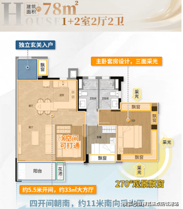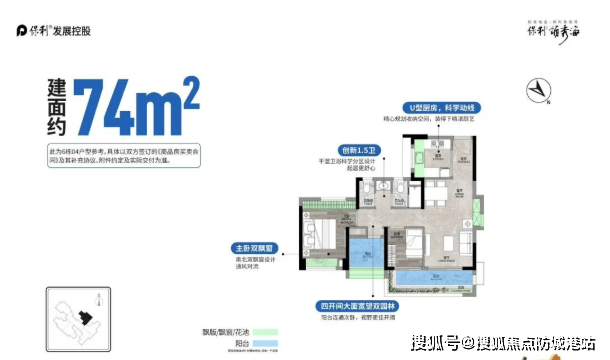 77㎡三房两厅两卫:四开间朝南,南向采光面超11米,主卧可放1.8米大床,270°观景视野直面园林。