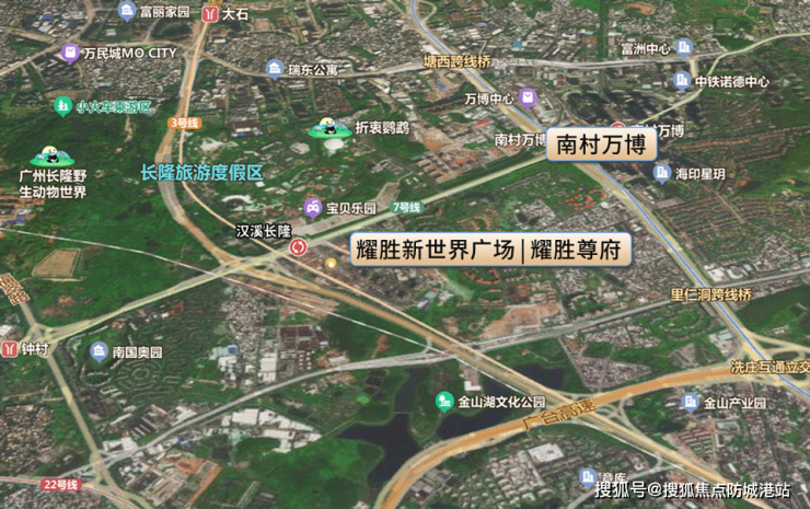 耀胜新世界广场·耀胜尊府坐落于广州市番禺区汉兴西路,地处万博-长隆商圈核心位置,占位片区“弓箭交合”的风水宝地——以新光快速为弓,汉溪大道为箭,项目恰好位于弓箭交汇之处,汇聚商圈旺气,成为区域价值高地。作为大湾区几何中心的重要节点,项目凭借优越的地理位置,无缝衔接广州、佛山、东莞三大城市,构建湾区一小时生活圈。