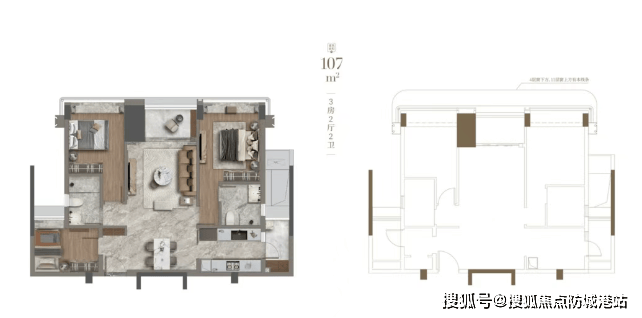 约107㎡3房两厅两卫:适合小家庭或首次置业者。