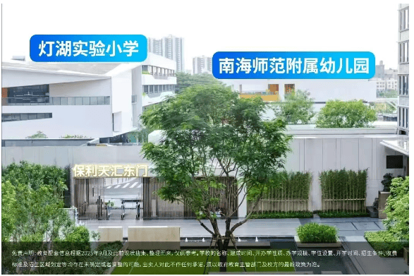 教育,是改善家庭最敏感的神经。保利天汇·汇悦组团的最大杀招,正是家门口配建的双名校:南海师范附属幼儿园与灯湖实验小学均已开学,并纳入南海实验中学教育集团统一管理。这意味着从幼儿园到初中,孩子可享受南海区头部教育资源闭环。尤其灯湖实验小学,虽为新校,但依托南海实验中学的品牌输出、师资轮岗及课程体系,首年招生即满员,家长口碑持续发酵。值得一提的是,项目打造了佛山首个全连贯地库接送系统——雨天无需打伞,家长开车从地下车库直通学校接送区,安全又体面。尽管对口初中为映月中学(非传统名校),但片区业主多为重视教育的年轻家庭,社区学习氛围浓厚,有望形成“圈层带动学风”的良性循环。在教育焦虑蔓延的当下,这种“目送式上学+名校基因”的组合,极具说服力。