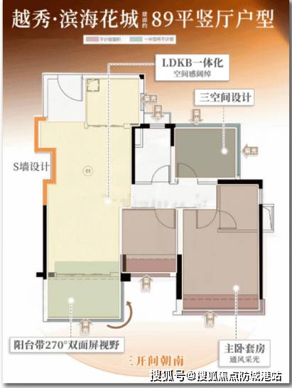 约89㎡的三空间2厅2卫:拥有更开阔的南向采光面,舒适度拉满。