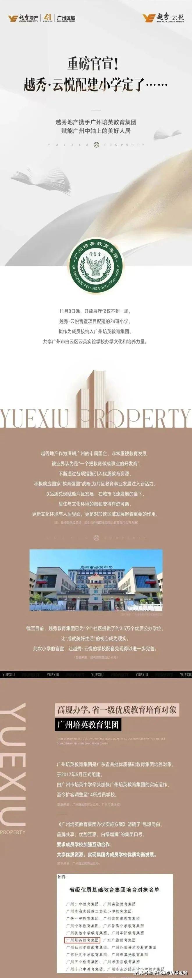 配建有一所9班幼儿园和一所24班小学,分别位于楼盘两侧。小学可能在开盘前公布学校级别,并且会引进白云最好的学校品牌,已纳入培英教育集团。初中大概率就读同和中学,也有可能划分到更好的学校。