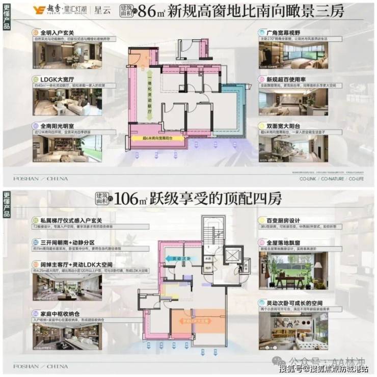 越秀星汇灯湖采用佛山最新建筑新规设计,阳台占比最高达 30%,折半计算容积率,飘窗全赠送且可拆除,户型得房率超 100%,远超周边二手房 80% 左右的得房率,同等面积多享约 20% 实用空间。主力户型为 86-116㎡三四房,其中 140 万即可入手精装三房,精准契合刚需、刚改家庭需求。
