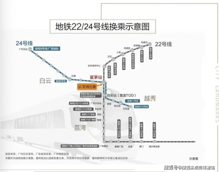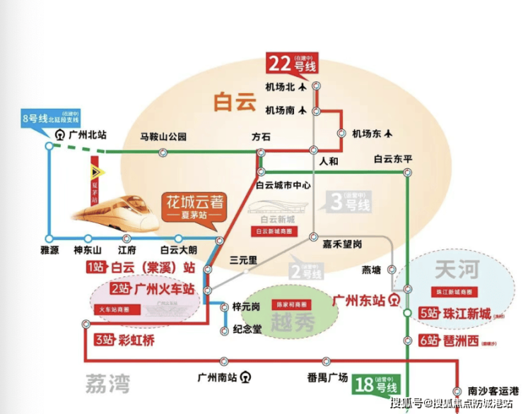 22 号线:1 站白云站、2 站越秀、3 站荔湾、5 站珠江新城,时速 160 公里,广州南北大动脉。