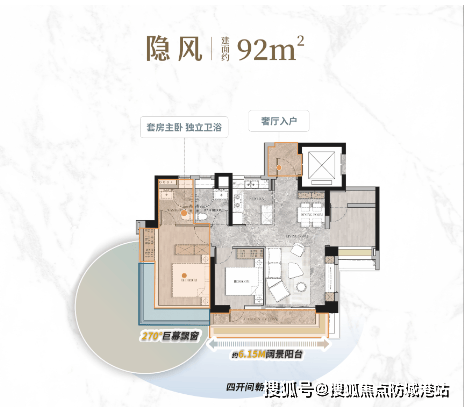 建面约92㎡:四开间朝南,约6.15米阔景阳台,主卧配备270°巨幕飘窗。