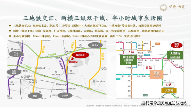 地铁方面,项目距离地铁21号线大观南路站约1.2公里,步行约20分钟,可1站换乘4号线,直达金融城、琶洲,4站到员村换乘5号线,快速接驳珠江新城。自驾方面,周边有广深高速、广园快速、大观路、机场第二高速(在建),可在40分钟内通达广州各核心城区,尤其是前往金融城、珠江新城、琶洲等地,通勤便利度高。