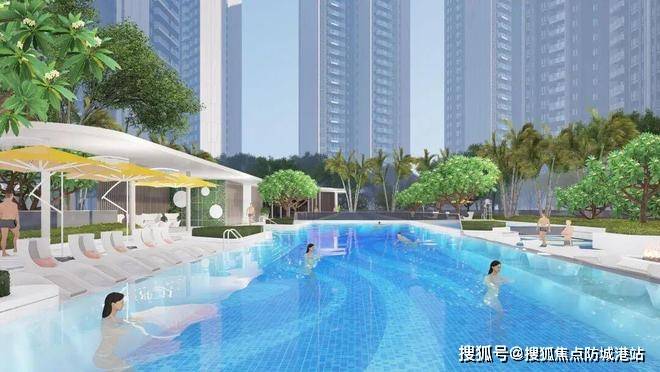 社区本身的设计和产品力也很用心。整体采用围合式布局,一核两轴四组团结构,中央是约1.2万方的超大花园,景观轴线拉到230米长。建筑立面融入了海洋元素,几何美学和精工细节结合,呈现出很强的公建化质感。社区最出彩的亮点之一就是中轴双泳池,像两颗蓝色宝石一样镶嵌在景观主轴上,属于高端社区才有的专属配置。