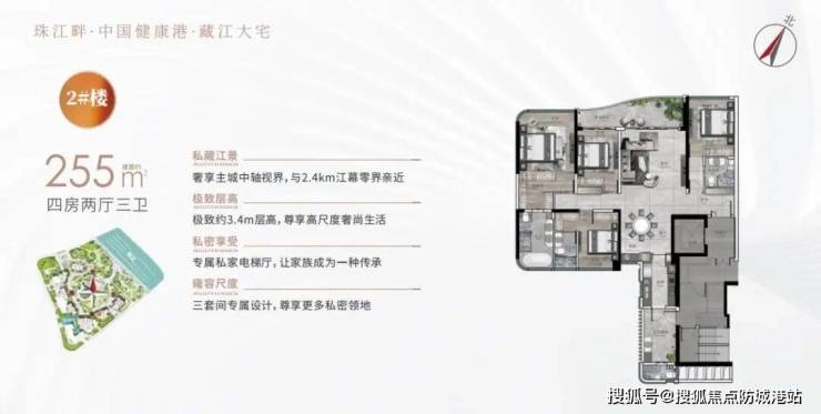 幸福湾主推255-285㎡无界江景大宅,全系一线三江汇聚景观位,强调极致面宽、多开间朝南与无敌视野。255㎡户型四至五房,方正通透、五开间朝南、超大景观阳台、LDKG一体化公区,主卧套房设计,视野开阔大气。285㎡顶配大平层尺度升级,约15-18米南向面宽、巨幕宽厅+多功能岛台、双套房或三套房布局,客卧双联一体天幕阳台,将三江天境尽收眼底;层高3.4-3.6米,空间恢宏,酒店式总统套房享受。整体户型全南向比例高、通风采光极致、阳台与窗台景观面宽大,三江资源不浪费一分,真正做到“在江上”的豪宅美学。户型注重功能灵活与健康细节,定制收纳、智能体系贯穿始终。在广州滨江豪宅市场,幸福湾以超大建面+无界天幕+稀缺江岸,定义千万级大平层价值,景观与空间体验位居顶尖。