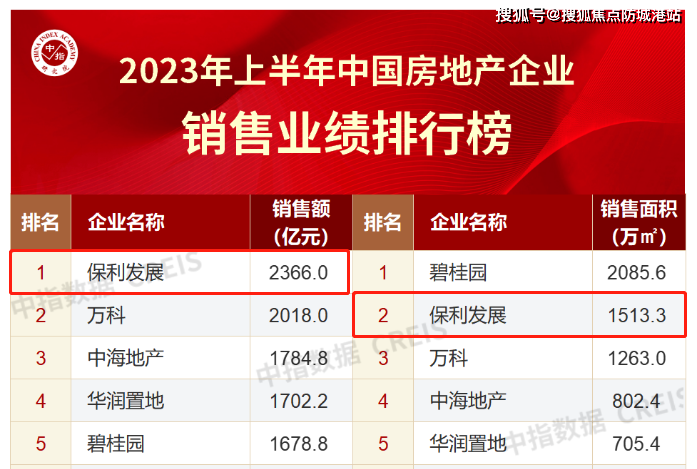 此外,根据中指研究院发布的2023年上半年中国房地产企业销售业绩排行榜来看,保利发展还以2366亿问鼎销售金额榜冠军!