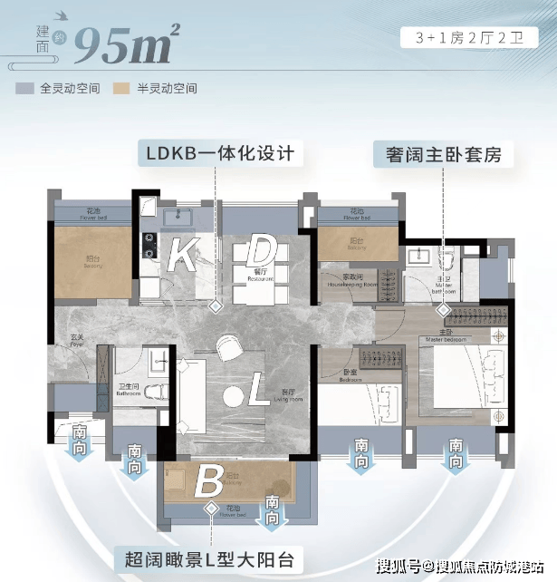 约95㎡四房两厅两卫:五开间朝南,超阔瞰景阳台,南北对流设计,奢阔私密主卧套房。