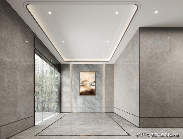 墙面与地面,采用灰色纹理瓷砖,高端且大气;电梯门头,则采用类古铜色不锈钢,通顶设计,搭配极简筒灯,营造现代质感。