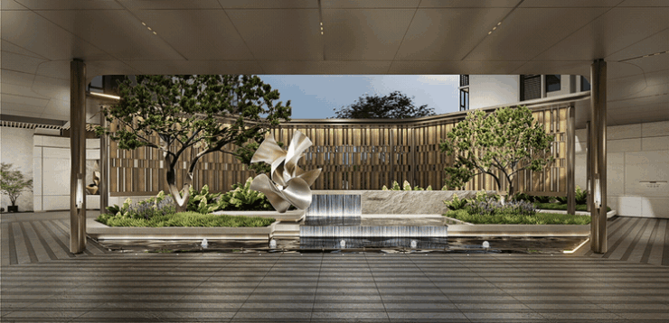 入口处,莫奈森林石材与贝金米黄奢石碰撞,像是春日永恒的嫩绿,极具品质感,雅而不俗。