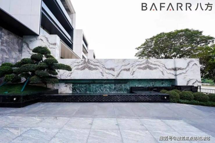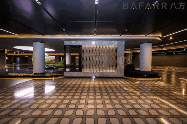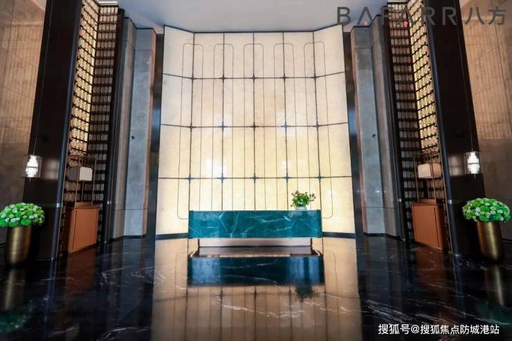 八方艺术中心不仅注重室内空间的设计,更是在公共区域上下足功夫。比如,别墅入口处使用PRADA绿天然奢石和蓝翡翠奢石等高档材料;园林内种植了红果冬青树、迎客松等珍贵树木;大平层的入户大堂参考宝格丽酒店风格,高达8.5米,地面铺设福鼎黑花岗岩,背景墙采用透光石材,尽显豪华大气。