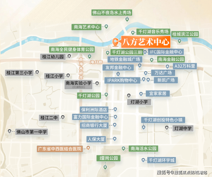 八方艺术中心坐落于佛山市南海区东片区千灯湖中轴核心位置,紧邻千灯湖公园三期,北侧是桂城滨江公园和佛山水道,南侧则靠近儿童公园,对面则是未来的南海艺术中心。这样的地理位置赋予了它独一无二的自然景观优势:有江、有湖、有公园、还有艺术氛围,使得这里的每一扇窗户都是一幅生动的画卷。