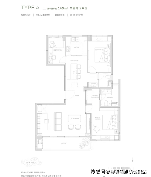 全系采用专梯专户设计(2梯2户或3梯2户),电梯直达入户门厅,提升归家私密性与尊崇感。交付标准引入“M+科技系统”,聚焦空气、饮水、环境三大健康维度,选用环保建材与智能设备,构建绿色健康居住环境。尽管部分户型未按新规优化得房率(如145㎡仅做三房),但其空间尺度与功能分区仍契合改善家庭需求。