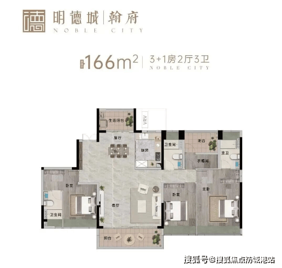 户型,是房子的灵魂。东建·明德城由华阳国际操刀建筑,推出两大产品系:“悦府”主打90-117㎡新规准现楼,户户朝南,采用LDK一体化、开放式厨房、灵动飘窗设计,使用率超80%;“翰府”则聚焦改善客群,推出107-144㎡四房及142-167㎡专梯专户小高层,部分高层单位甚至可远眺广州塔。尤其166㎡顶配户型,堪称教科书级设计:四开间朝南、南北对流双阳台、8.4米进深客厅、3.15米层高、双主卧套房,私密性与尺度感兼得。全系近乎全南向布局,点状排布确保采光无遮挡。在佛山楼市“卷户型”的当下,明德城以高实用率、强功能性、优景观面,重新定义中芯改善人居标准。
