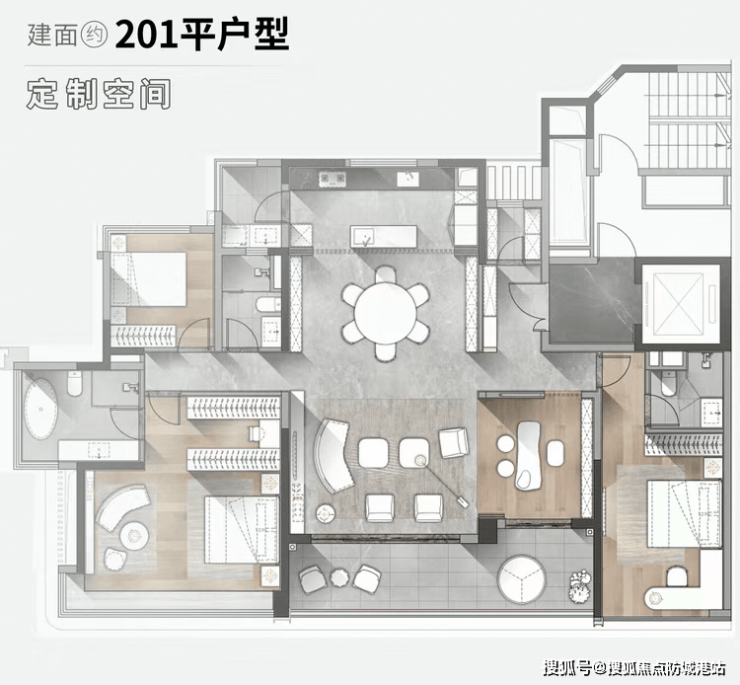 建面约205㎡四房两厅三卫户型,亮点在于双开间客厅设计,支持百变布局,可根据业主需求调整空间功能。同时,该户型搭载“X+1”定制空间,+1多功能空间可打造为封闭式卧室、工作室,或开放式调香室、茶室、书法空间等,无需业主后期改造,提前与开发商沟通即可定制专属生活场景。