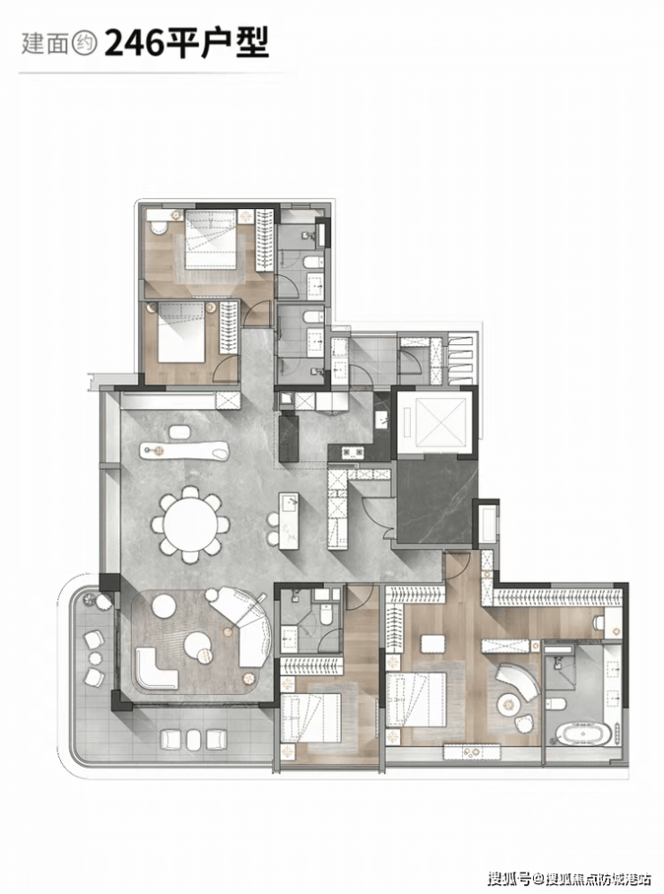 建面约246㎡四房两厅四卫户型,堪称江景户型的巅峰之作,享有约37米观江面宽,户型望江展开面宽比例达65.5%,将江景资源利用到极致。户型首创LDK四联聚厅设计,客餐厅、厨房与观景阳台相连,空间开阔通透,江风穿堂而过,全屋都能浸润在江景与清风之中。主卧套间配备观江浴缸,躺在床上、坐在工作台前,都能欣赏到层次丰富的珠江景观。