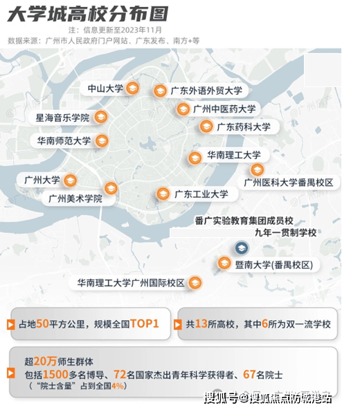 板块内已汇聚华南理工大学国际校区、暨南大学番禺校区、广州医科大学(番禺校区)等顶尖学府,形成了强大的“高校知识圈层”。约20万师生、科研人员在此工作生活,构成了广州乃至大湾区密度最高、素质最齐整的智力资源库。这种“同质而居”的圈层效应,不仅营造了无比纯粹、浓厚的学术氛围,更意味着您的邻居、孩子的玩伴,极有可能来自高校教授、科研专家、企业高管等高知家庭,为下一代创造了得天独厚的成长环境。