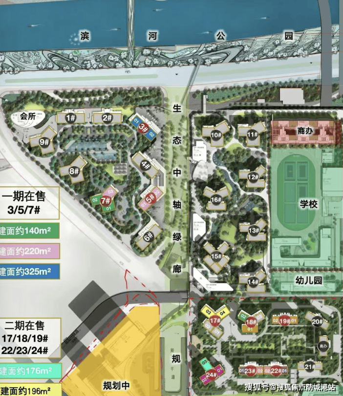 二期产品升级: 相比一期,二期密度整体更低,容积率仅2.0,只做了8栋住宅,内部预留了大面积的园林空间,形成复合景观,舒适度和私密度都更高。产品整体以13-24层的小高层为主,居住体验更佳。