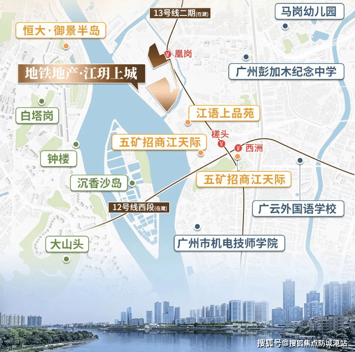 项目的交通优势堪称“顶配”:坐享广州地铁12号线、13号线(建设中)与佛山地铁8号线(规划中)三线交汇利好。其中,地铁13号线二期凰岗站为项目真上盖,业主可通过地下通道直达站厅,实现“出家门即进地铁”的无缝衔接。根据官方规划,13号线二期预计2025年开通,东连天河公园,西接朝阳,贯穿珠江新城、金融城等核心CBD,未来无需换乘即可15分钟内抵达珠江新城,彻底解决通勤难题。此外,项目距已开通的地铁12号线西洲站约800米,两条线路形成双轨交汇格局,大幅提升通勤效率;规划中的佛山地铁8号线开通后,将实现广佛两地无缝对接,跨城出行更加便捷。