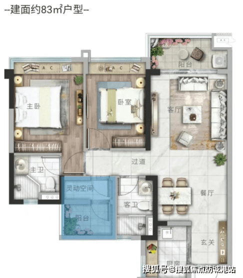 83–99㎡三房:全明格局,南向主卧,部分带双阳台;