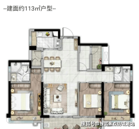 107–113㎡四房:四开间朝南,主卧套房,U型厨房,动静分区;