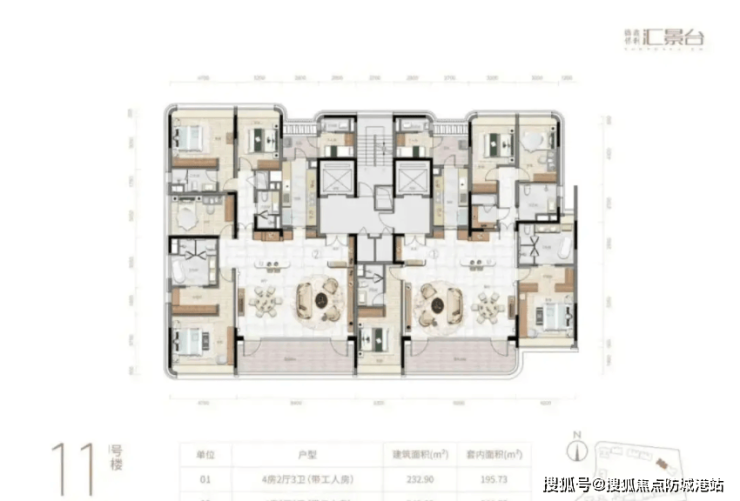 11栋的232-240㎡四房三卫,是保利汇景台的热门改善户型,凭借超高的实用率和优越的户型设计,深受改善家庭的青睐。根据项目官方数据显示,这款户型的实用率约83%,在天河核心板块的改善盘里,这样的实用率堪称“佼佼者”——要知道,很多楼盘的实用率只有75%左右,同样的面积,保利汇景台能多出更多的使用空间,性价比直接拉满。