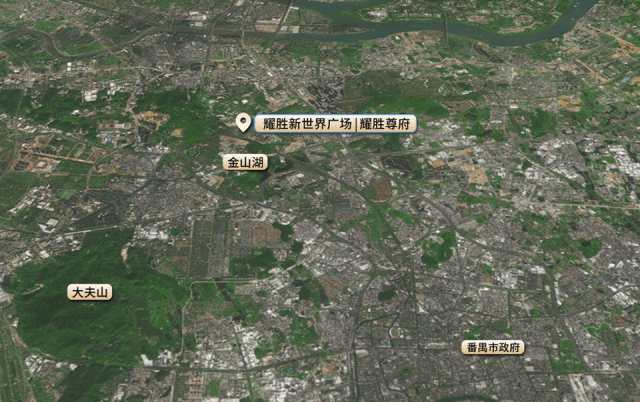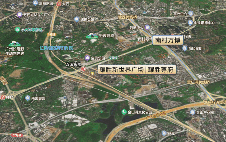 项目位于番禺区汉兴西路,核心万博-长隆商圈的三轨交汇枢纽之上,地理位置极其优越。南临大夫山,背靠番禺市政府,形成天然的城市靠山;北面珠江支流环绕,金山湖与大岗岭环抱,地理与风水兼具优势。周边区域正在扩容,长隆万博商务区的快速发展带动板块整体价值提升,汉溪大道和新光快速交汇,使得区域人流、商业资源和财富聚集效应明显增强。耀胜新世界广场·耀胜尊府的地理优势不仅体现在景观与风水,更是其未来价值增幅的重要保障。