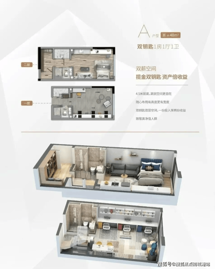 C户型以及建面约58㎡的三房户型则设计了独立厨房,接通燃气管道可明火使用,满足了购房者对居家烟火气息的需求。建面约50㎡的户型是项目最受欢迎的户型之一,4.5米层高的阔绰客厅,每层拥有1房1厅1卫的布局,空间利用率极高。